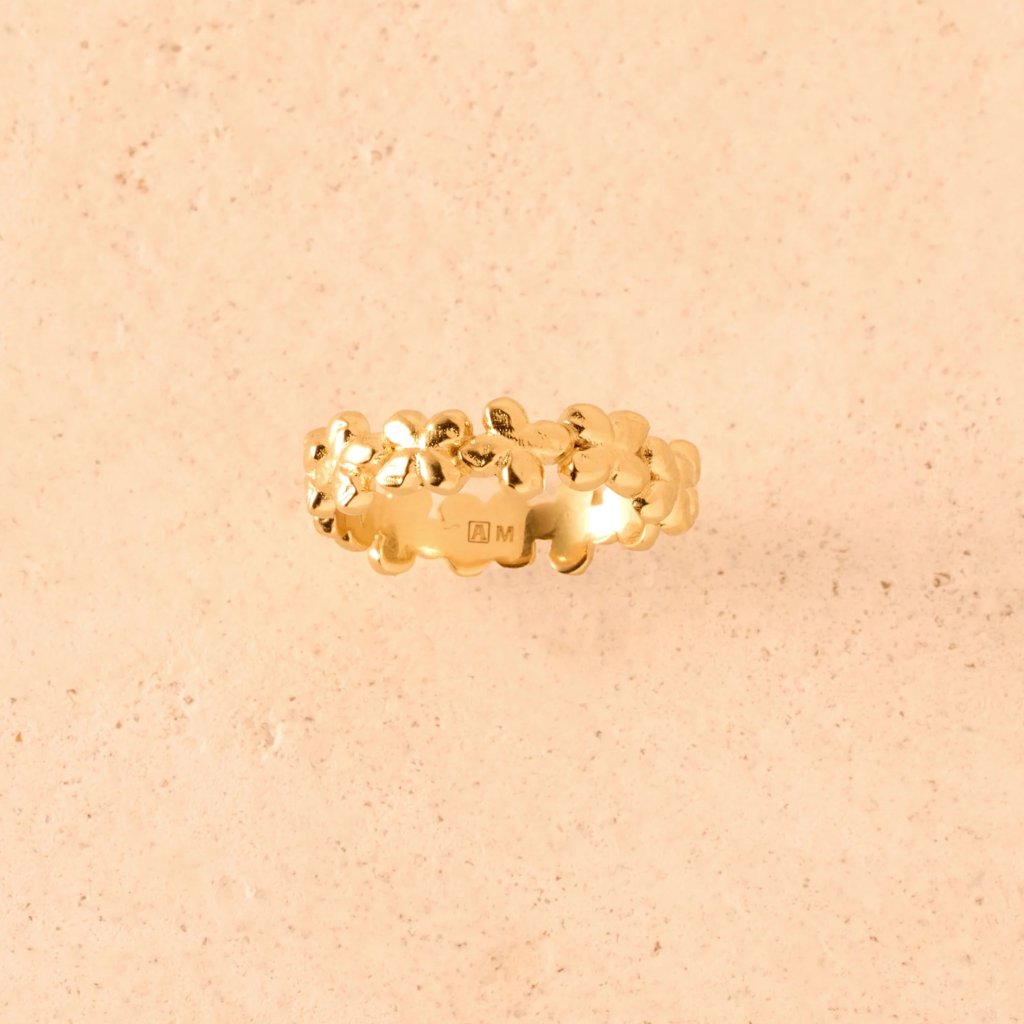 Elegance a štěstí v jednom s prstenem LAURA. Tento jedinečný šperk je tvořen ze zlatých čtyřlístků, které jsou spojené do souvislého pásu. Zaoblené lístky a mírně nepravidelný povrch dodávají prstenu přirozený a sofistikovaný vzhled. Ideální pro ty, kteří hledají něco výjimečného a symbolického. Pro dokonalý set můžete prsten kombinovat s náramkem ze stejné kolekce, který doplní váš styl o další vrstvu elegance. Dodejte svému šatníku nádech luxusu.