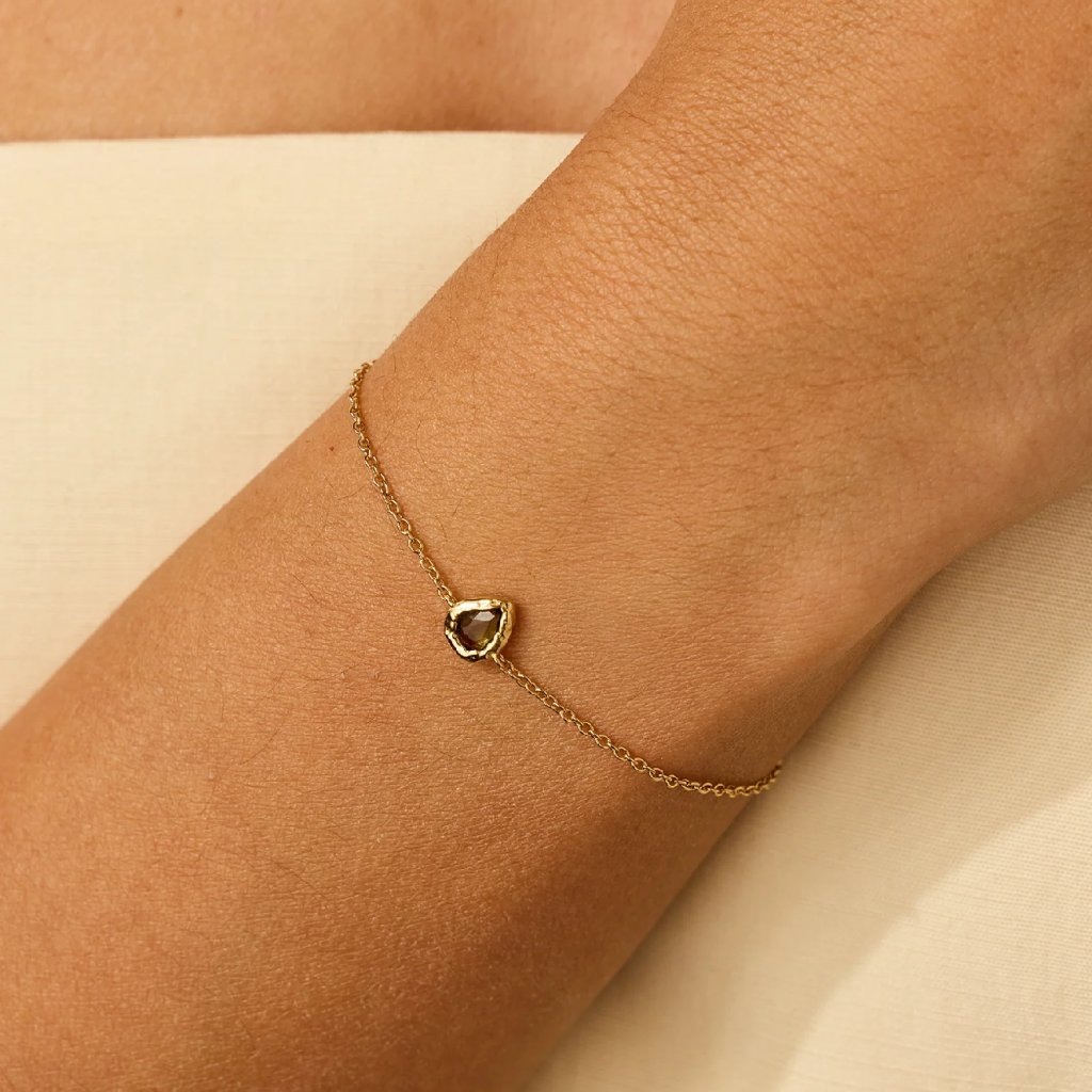 Představujeme vám elegantní náramek LYSIA, který je skvělým doplňkem pro každou příležitost. Tento jemný šperk se pyšní malým motivem ve tvaru kapky, který je umístěn na delikátním řetízku. Dominantou náramku je tmavě zelený kámen, ručně zasazený do texturovaného zlata, což dodává celému kousku unikátní a luxusní vzhled. Náramek je součástí kolekce, která zahrnuje také náušnice a náhrdelník, takže si můžete vytvořit dokonalý set. Vhodný pro milovníky jemné elegance.