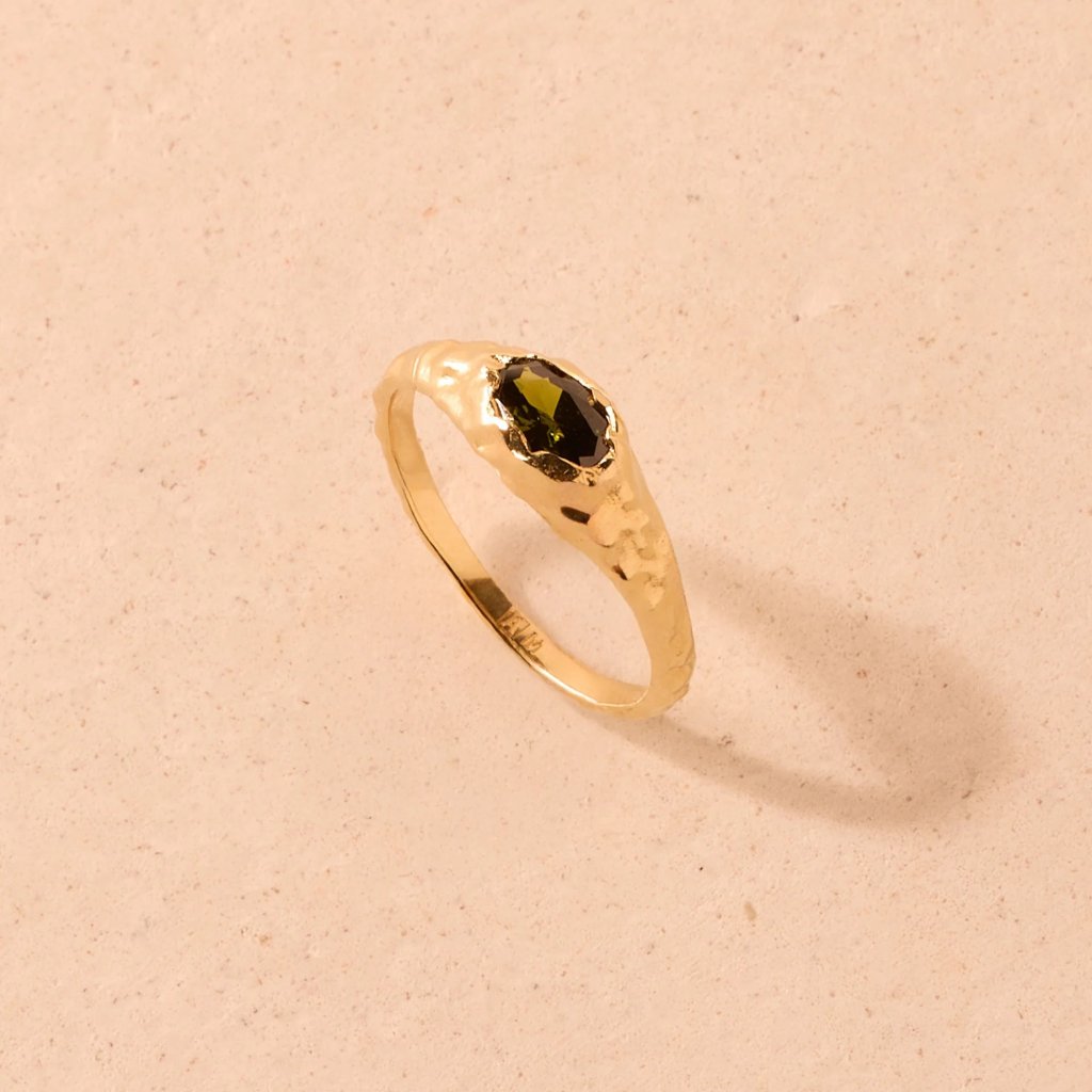 Elegantní kouzlo prstenu MARIA GREEN. Tento tenký prsten se pyšní kopulovitým tvarem a povrchem s efektem tepaného kovu. Dominantou je oválný tmavě zelený kámen s fazetovým brusem, který je zasazen do surového, strukturovaného zlata. Nepravidelný povrch prstenu vytváří fascinující kontrast mezi kovem a kamenem, což dodává šperku jedinečný a sofistikovaný vzhled. Ideální volba pro ty, kteří touží po originálním a vkusném doplňku.