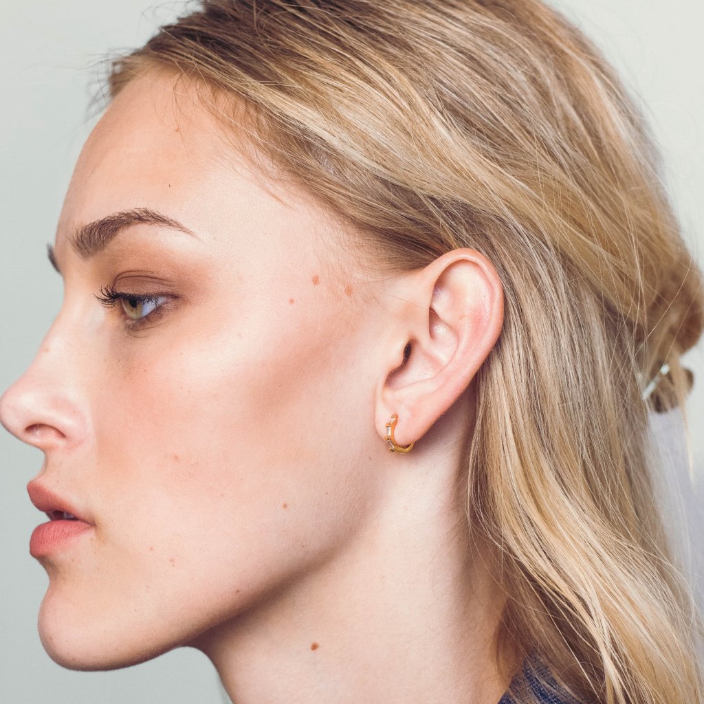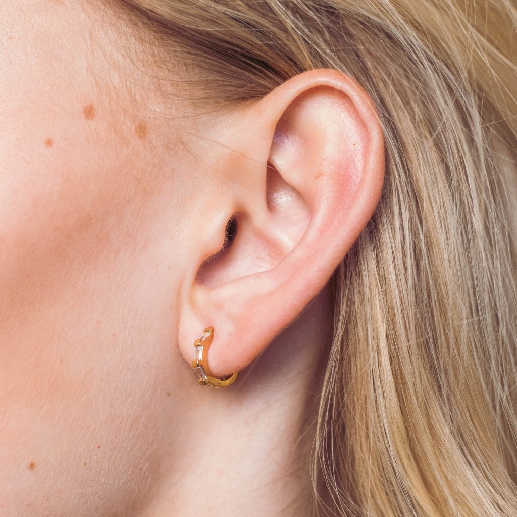 Tato nádherná náušnice BAGUETTE GOLD HOOP s kroužkem obepínající lalůček je osázena řadou třpytivých zirkonů. Jemný přesto naprosto výjimečný a okatý šperk, který musíte ve své šperkovnici mít. Pro stříbrnou variantu sáhněte po BAGUETTE SILVER HOOP.
