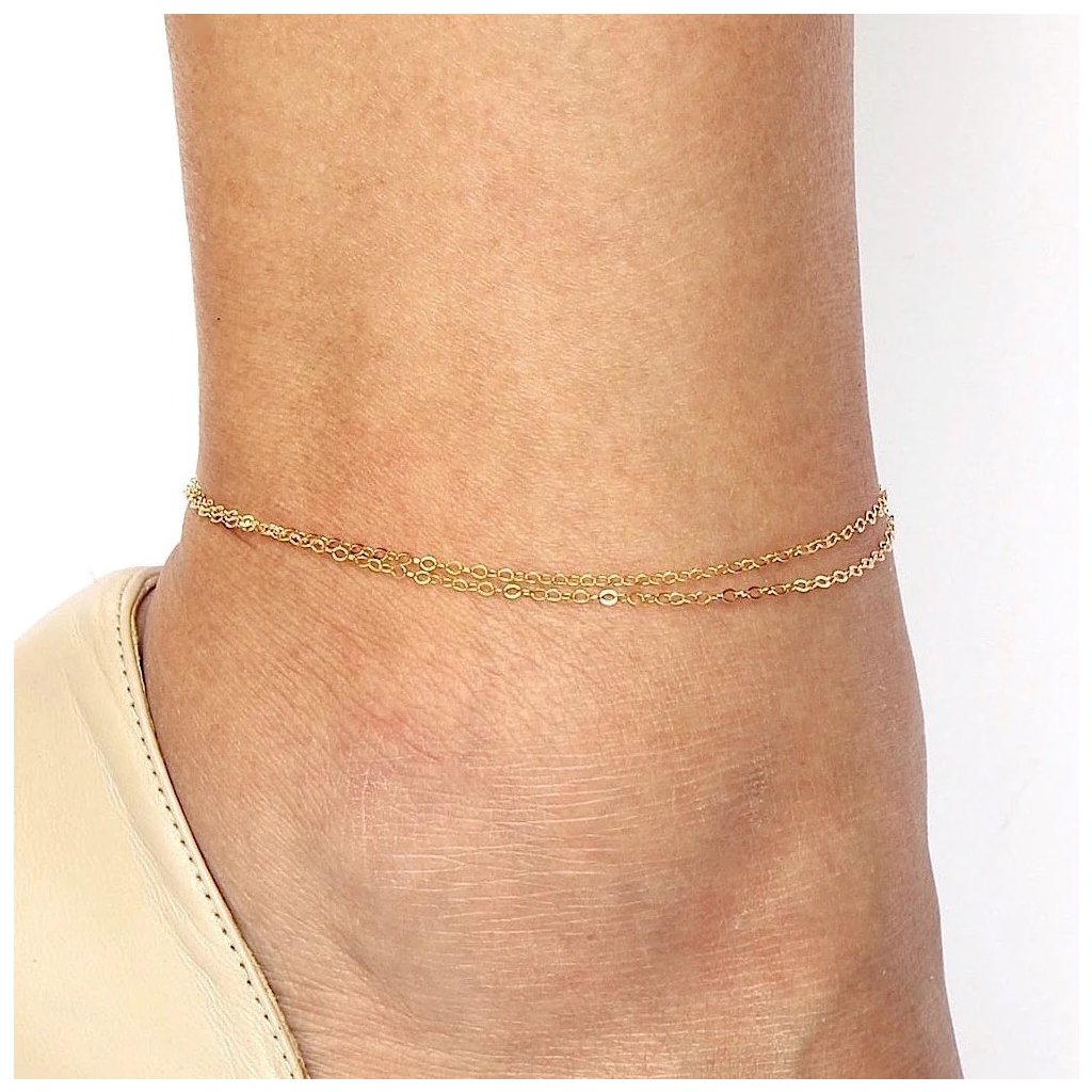 Minimalistický jemný řetízkový náramek na kotník DOUBLE BASIC. Skvěle se bude vrstvit s ostatními šperky NIIKA. Pro minimalistický vzhled jej noste samostatně. Nechte se unést nadčasovostí tohoto zlatého náramku.