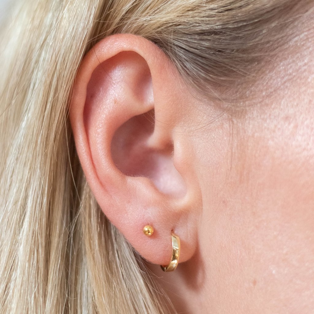 Minimalistický piercing do ucha s detailem drobné kuličky. Piercing je vyrobený z chirurgické oceli a pozlacený. Kombinujte jej s výraznějšími náušnicemi pro odvážnější look. Dostupný také ve stříbrné variantě SILVER DOT nebo ve variantě 2 mm GOLD DOT BABY.
