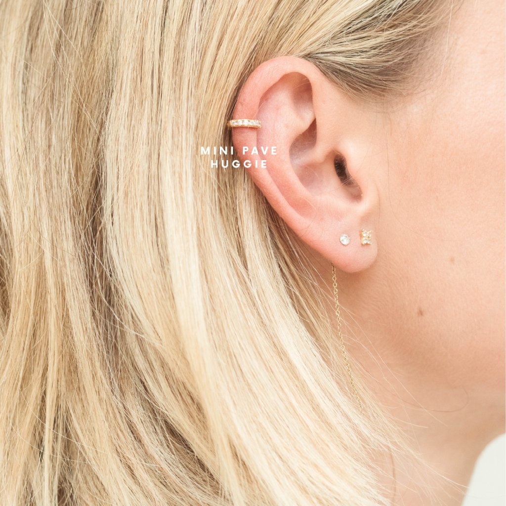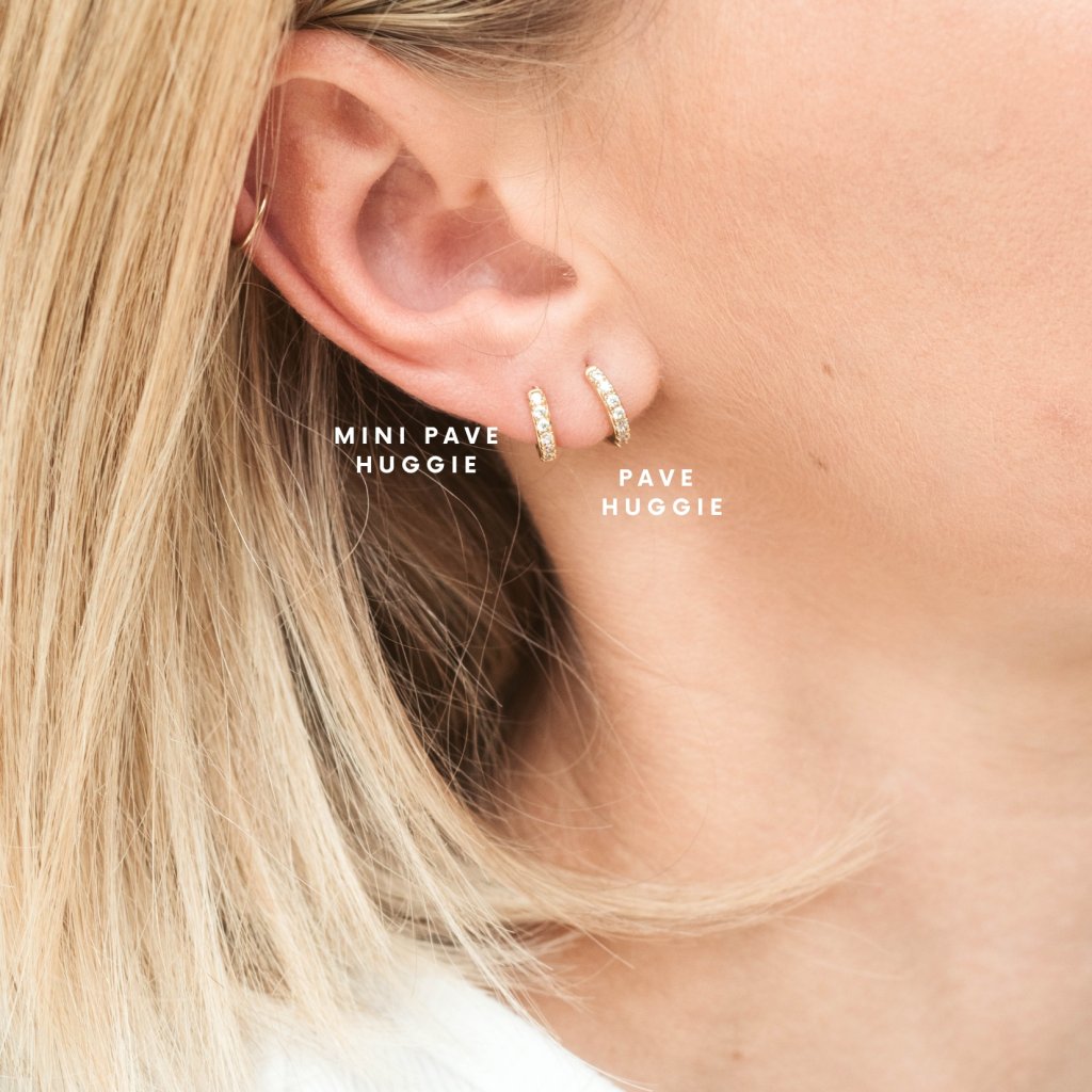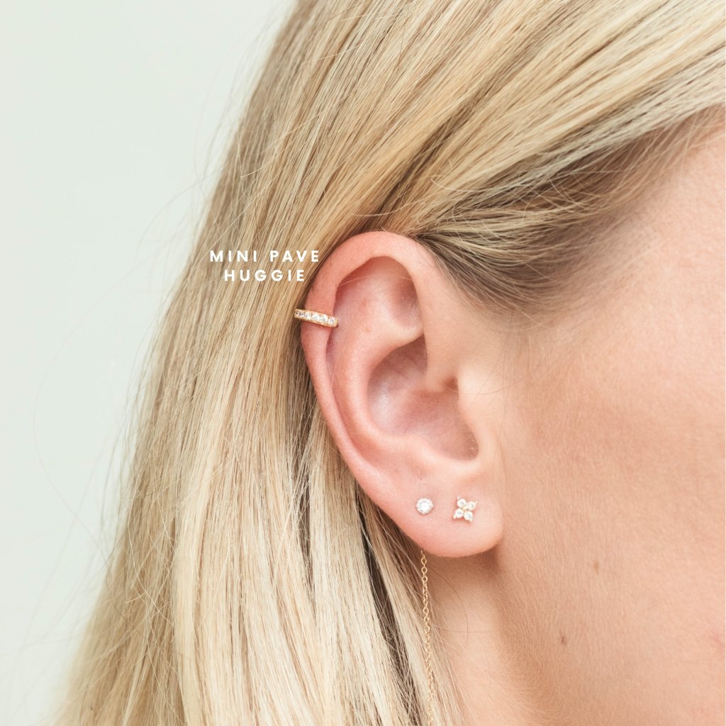 UPOZORNĚNÍ: Tento šperk je velmi drobný, doporučujeme zkontrolovat rozměry před objednávkou. Ne všem může velikost v helixu sedět. Ve větší velikosti náušnici najdete jako GOLD PAVE HUGGIE.
