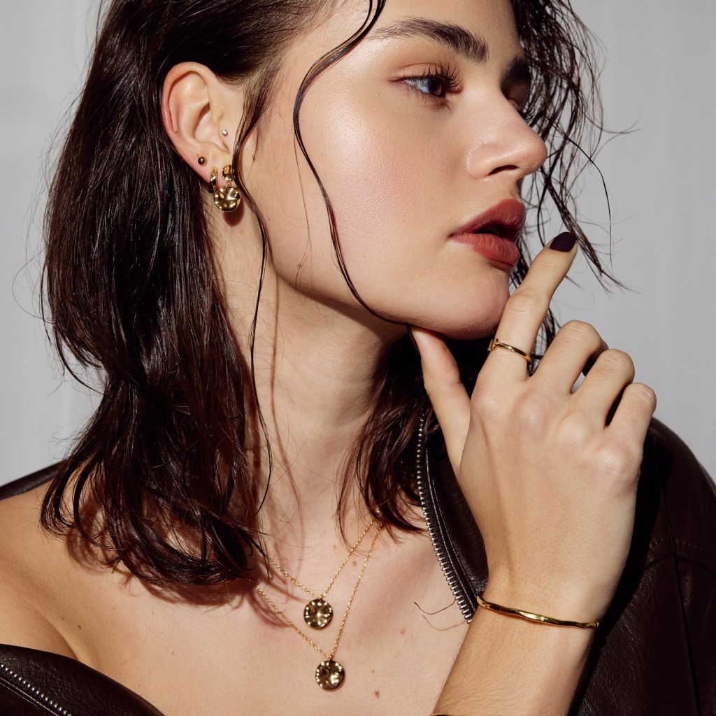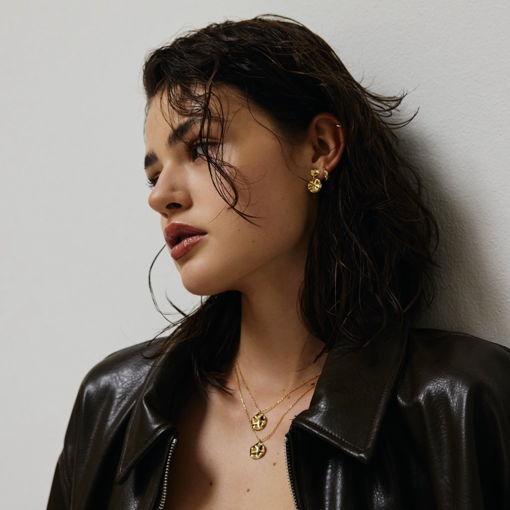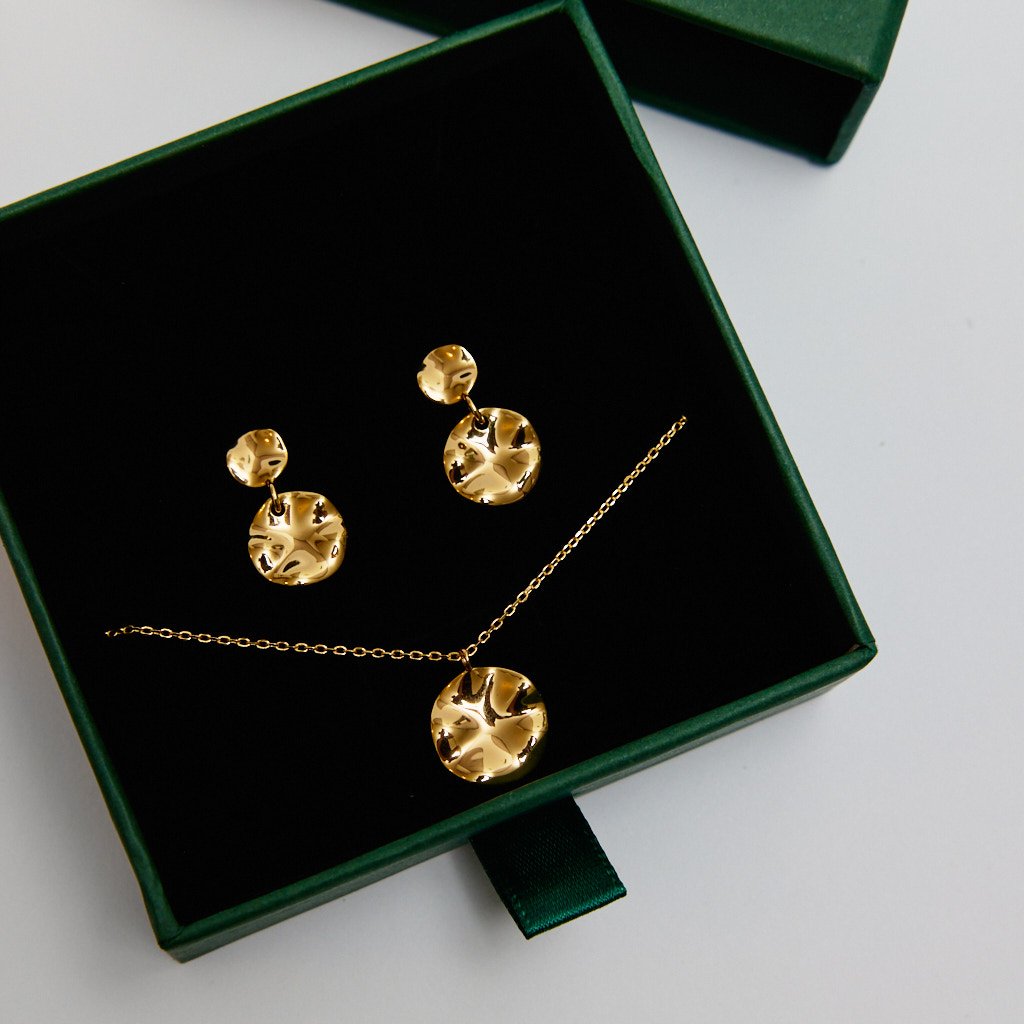 Elegantní set náušnic a náhrdelníku ze stejné kolekce ASYMETRIC ve zlatém provedení. Jeho detail je perfektně propracovaný a vzhled bezpochyby nadčasový. Náušnice jsou složeny ze dvou nepravidelných placiček - menší a větší, napojené na sebe. Náhrdelníku dominuje zavěšená nepravidelná placička na jemném řetízku značící eleganci. Díky těmto kouskům opravdu zazáříte. Precizně vyrobeno v ČR – s důrazem na detail, kvalitu a lokální řemeslo.