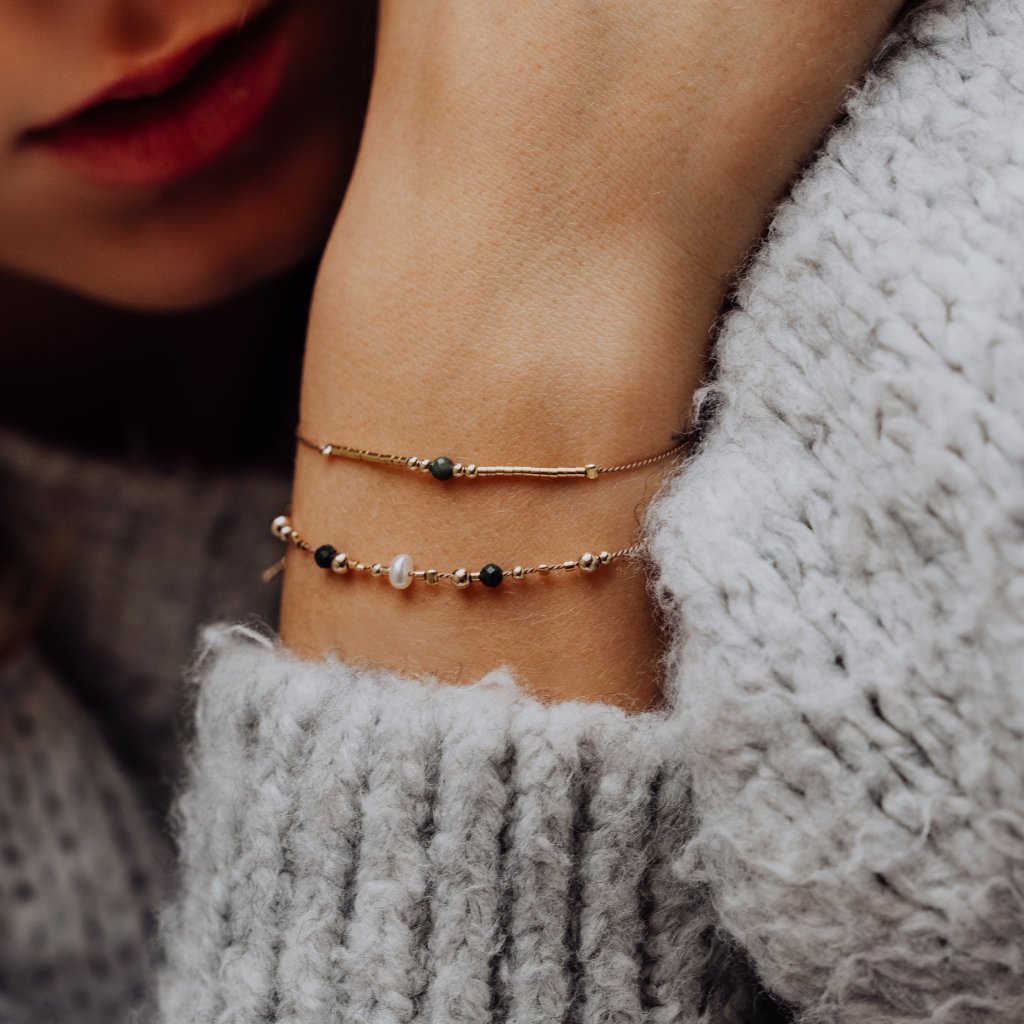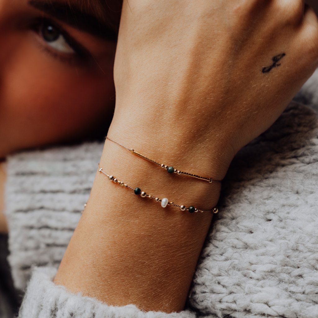 Dopřejte si nenucenou eleganci s tímto setem ručně vyráběných náramků na šňůrce, které kombinují jemnost a nadčasový design. Náramky jsou vyrobeny z hedvábné niti a doplněny pečlivě vybranými kovovými detaily, zelenými kamínky achátu indického, které dodávají stylový a sofistikovaný vzhled. Ideální pro vrstvení s dalšími náramky. Univerzální doplněk vhodný pro každodenní nošení i speciální příležitosti. Perfektní tip na dárek, který potěší svou jednoduchostí i elegancí.