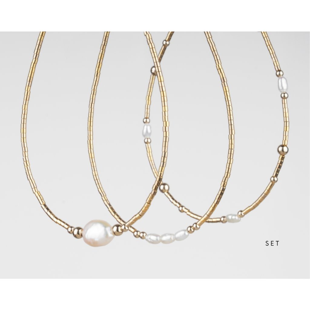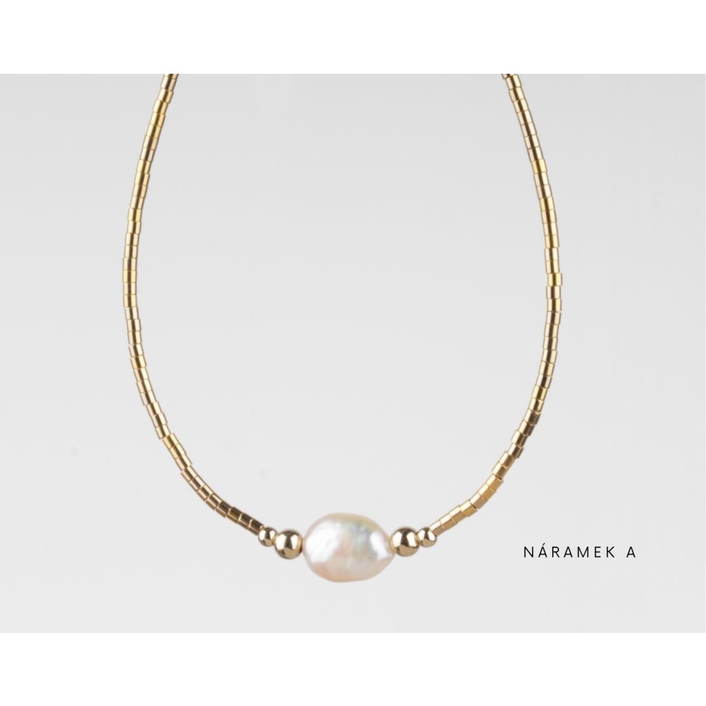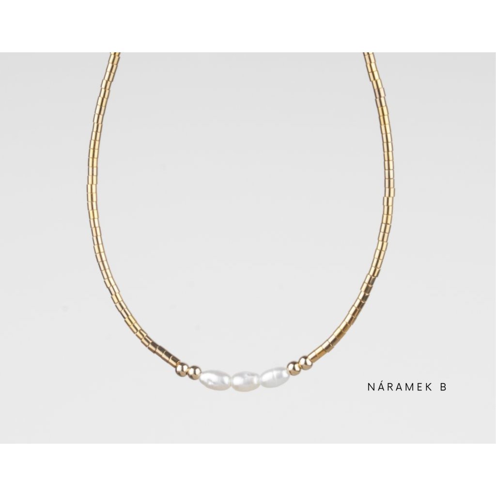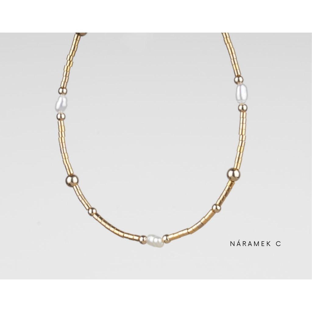 Dopřejte si jemnou eleganci v podobě setu ručně vyráběných korálkových náramků, které zaujmou nadčasovou kombinací pravých říčních perel a zlatých komponentů z gold filled materiálu. Každý náramek je pečlivě navržen tak, aby krásně vynikl samostatně, ale zároveň tvořil harmonický celek v rámci celého setu. Set se skládá z několika jemných náramků různého designu, které spolu přirozeně ladí a umožňují variabilní styling. Náramky můžete nosit jednotlivě pro čistý, minimalistický vzhled, nebo je kombinovat a vytvořit tak výraznější, vrstvený styl.