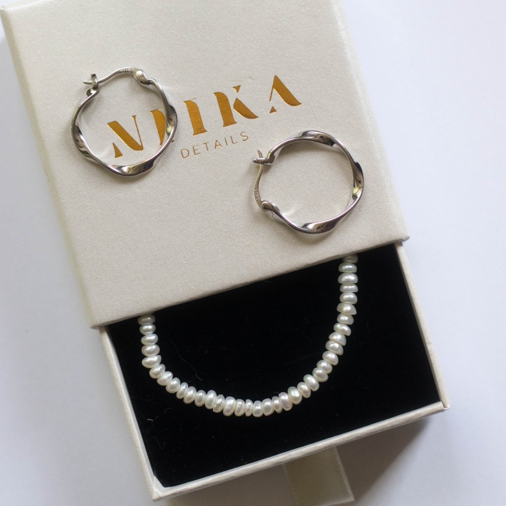 Představujeme vám set složený z našich bestsellerů! Náušnice SILVER CURLY HOOP jsou kombinací elegance a nadčasového vzhledu. Jejich plynulé křivky z nich činí perfektní doplněk pro váš denní i večerní outfit. V kombinaci s perlovým náhrdelníkem WHITE PEARLS, který značí minimalismus, tvoří dokonalý set. Tvar i odstín každé perly se může lišit.
